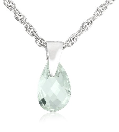 This stylish gemstone pendant features an 8x5mm pear-shaped briolette of green amethyst, clutched by a sleek polished bail. Both the setting and the 18-inch light rope chain are made from sterling silver. The subtle and alluring color of green amethyst--nearly clear, with a light wash of pale leek green--makes this a very elegant, distinctive, and versatile gemstone. It's also quite durable, and well-suited for everyday wear.